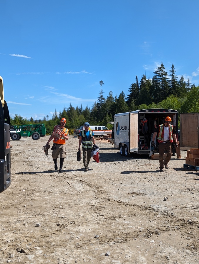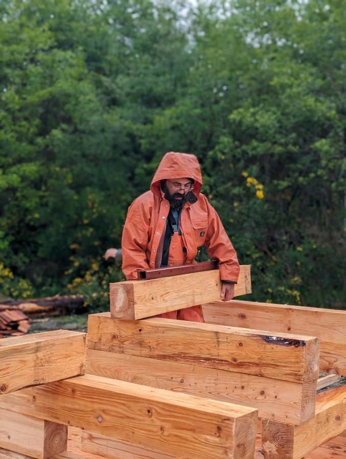 The first 3 days of the build were marked by an atmospheric river that brought torrential rain and heavy winds . Those extremes were followed by warmer than usual temperatures and lots of sun. Working out in the elements combined with the remote location on a large ambitious frame made this an exciting and challenging build. Volunteers came from all over the US and Canada and crew members worked tirelessly for 3 weeks against the rugged and stunningly beautiful backdrop of Vancouver Island’s west coast.