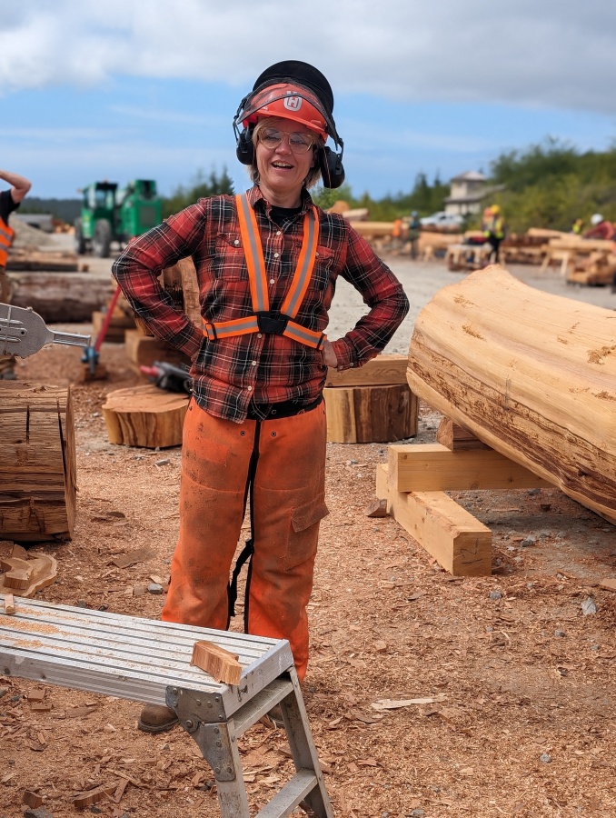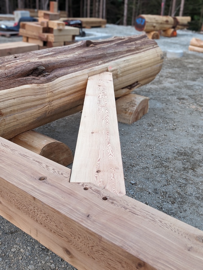 The design of the frame provided many learning opportunities, including round log to square timber framing, chainsaw work, compound roof framing, scribing, crane rigging, and working with red cedar.