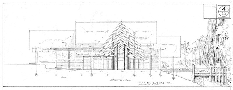 The new Bamfield Community Hall is approximately 5,000 square feet, and largely timber framed, with round log columns and steep-pitched scissor chord rafter assemblies that form multiple rooflines. There are three flat roof areas supported by timber framed beams and columns, and a large outdoor deck with timber support beams and posts on concrete columns.