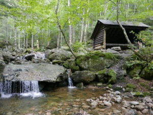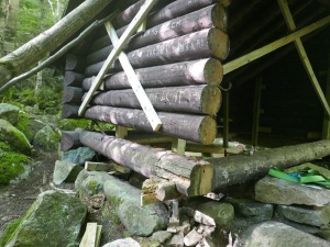 This was a unique TFG undertaking in which an instructor, Guild member Adam Miller, teamed up with US Forest Service personnel to undertake some interesting repairs to a 1935 shelter structure.Participants hiked in and camped on-site for this heritage conservation training workshop, which focused on repair to the log-built structure and the training of Forest Service trail crews to care for and repair simple wood structures in their district. The Coppermine Shelter was built in 1935 by the Civilian Conservation Corps, who utilized the Forest Camp Adirondack Shelter 1935 standard plan. The White Mountain National Forest (WMNF) Hiking Shelter System was determined eligible for listing in the National Register of Historic Places for its significance to the development of outdoor recreation in New Hampshire and the United States, as a rare and early example of a hiking shelter network, and as examples of the evolution of the Adirondack Rustic Style. The Coppermine hiking trail, which accesses the shelter and Bridal Veil Falls from the west side of Cannon Mountain, was constructed by the Appalachian Mountain Club in 1881. The 1935 WMNF Recreation Plan states that the Coppermine shelter was intended to serve both skiers and hikers; however, the Coppermine ski trail eventually fell out of use, as later ski resort development focused on the eastern slopes of Cannon Mountain. The Coppermine ski trail can be traced with difficulty today, and the shelter is primarily accessed by hikers via the Coppermine hiking trail, which ends just past the shelter at Bridal Veil Falls.