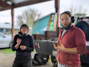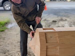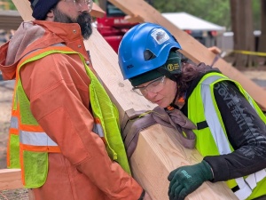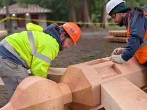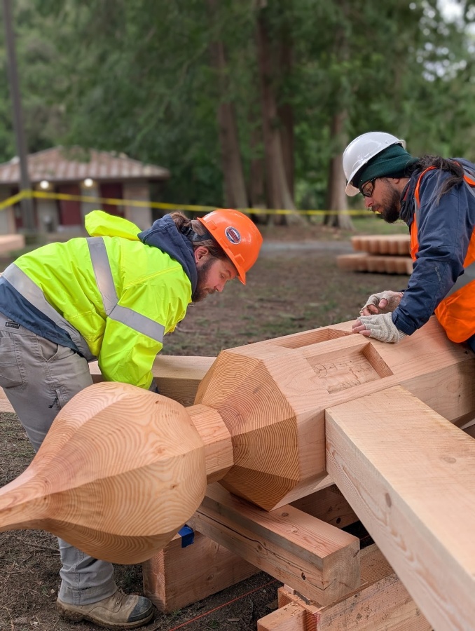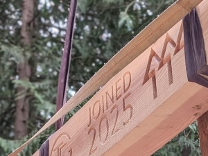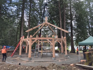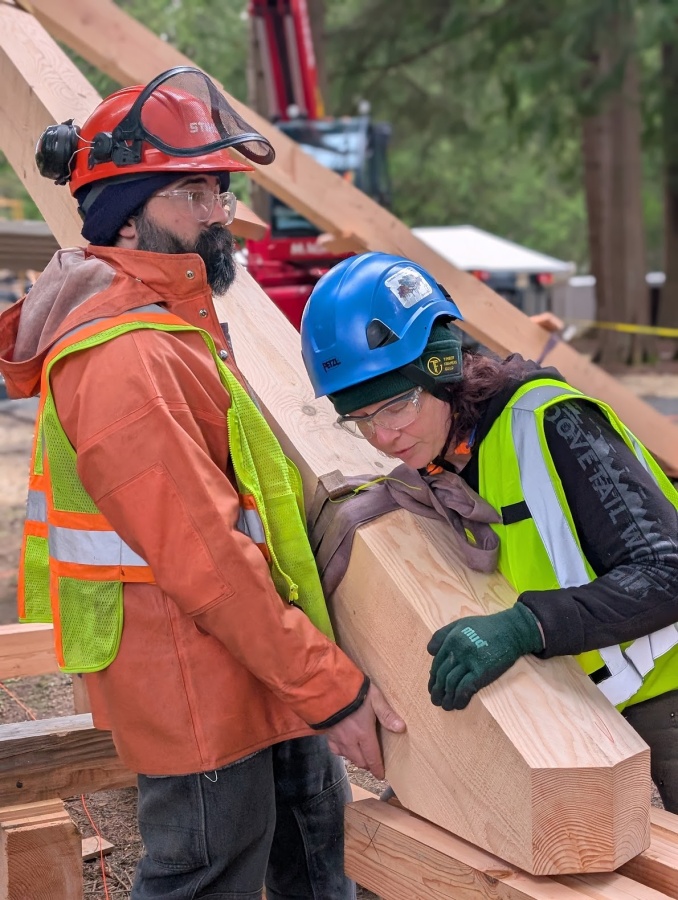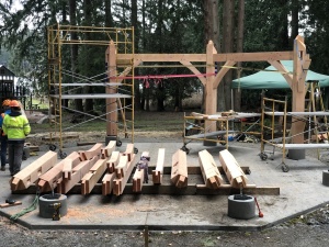 March 16-23 2025. Members of the Timber Framers Guild gathered in Monroe, Washington, to build a park pavilion for Flowing Lake Park in Snohomish County. the work took place at the Evergreen State Fairgrounds and the Flowing Lake Park & Campground located approximately 15 minutes north of Monroe.