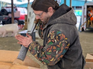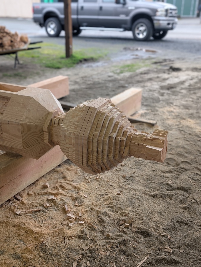 The cutting took place at Evergreen State Fairground. Volunteers camped on site during cutting and then the whole operation moved to Flowing Lake State Park for installation and raising.