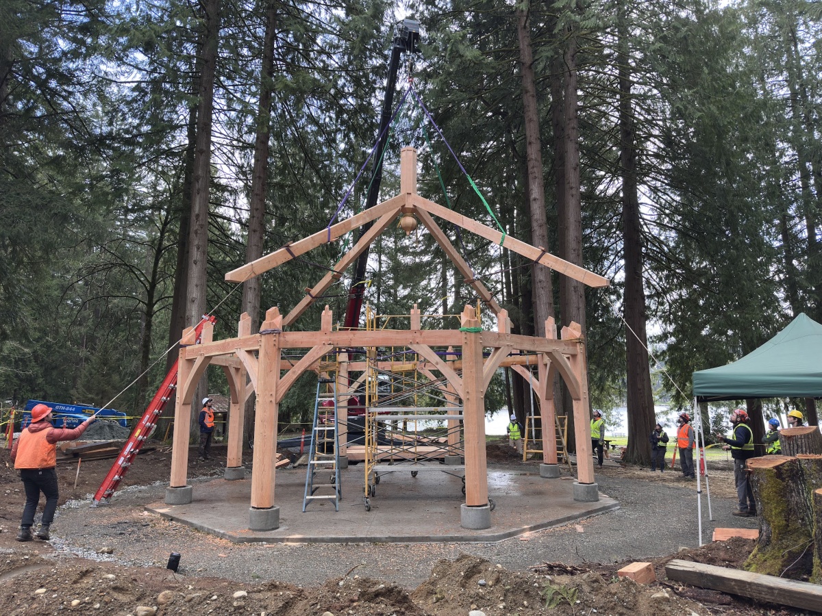 The structure is octagonal with a hipped roof with a large central boss pin, supporting a monitor or lantern roof at the top. Joinery is a mix of traditional and contemporary connections. Timbers are rough sawn Douglas fir.