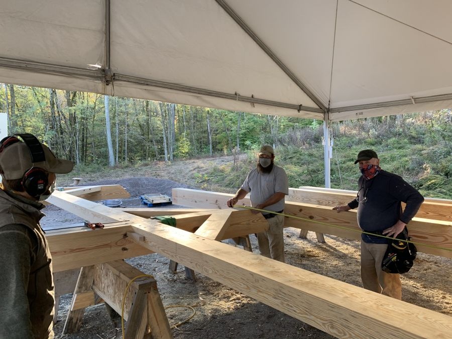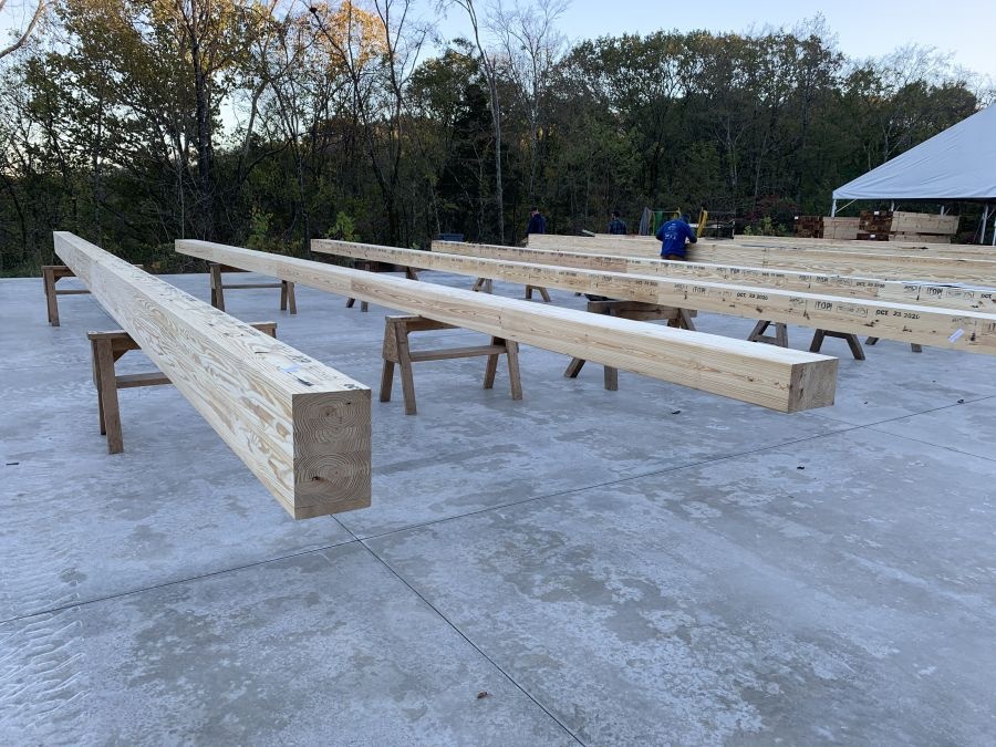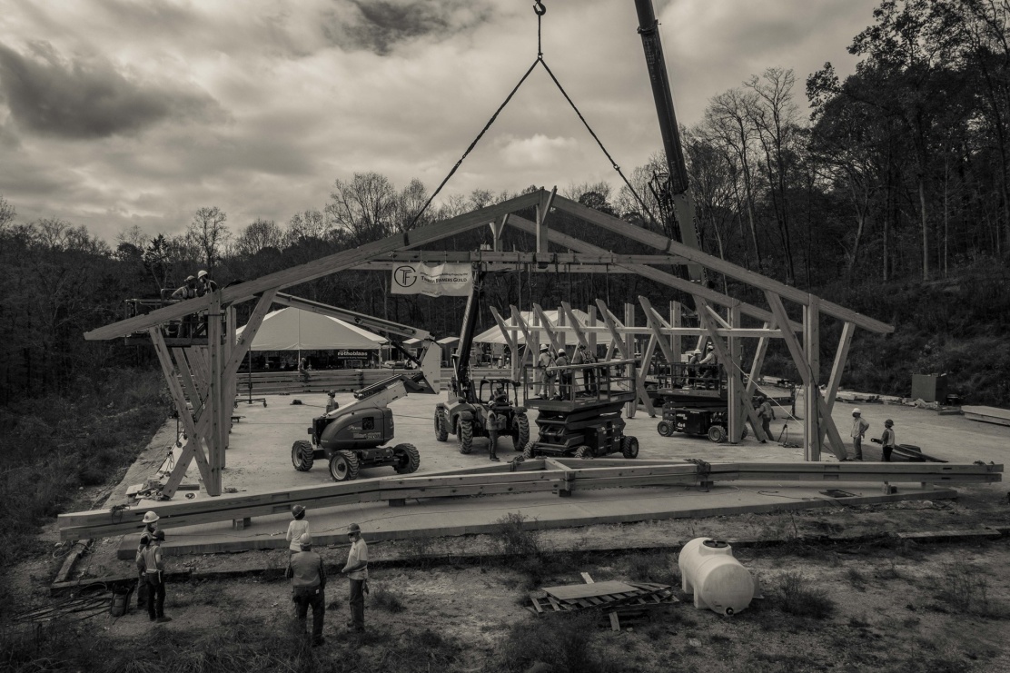 The 2-week workshop culminated in the raising of a pavilion that measured 78-½ feet drip line to drip line and 111 feet long and 28 feet tall. The eight-bent frame design is comprised of over 470 southern pine timbers and glulams (for the 42-foot rafters) and over 30,000 board feet, grabbing a large volume of space with no interior posts and making it an ideal choice for a sports pavilion. The pavilion was designed by Joe Miller of Fire Tower Engineered Timber to accommodate both full-size high school basketball and volleyball courts.