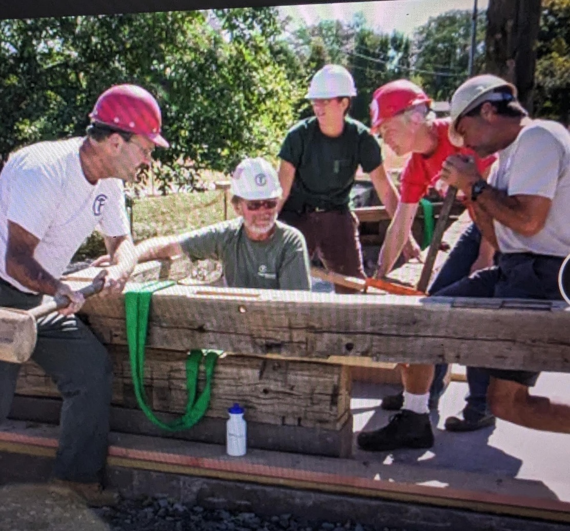 The site was prepared by the city, and it was time for the timber framers to go to work. Volunteers started work, arriving from all over the country. They pitched tents and set up campers in preparation for the two-week job. The site was next to Greensview Elementary School. Neither the students nor the craftsmen knew what a treat they were in for. The students were curious, and the workers were willing to share their knowledge of this ancient building technology.