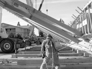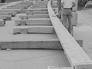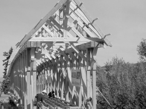 50 m (156 ft.) long. The bridge structure is a modified Howe Trusses and a Burr Arch (from a local glulam plant). Truss cut on a Hundegger. Five-bent hammer beam truss system w 28-ft. span.