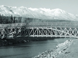 This bridge crosses the Kicking Horse River in southeastern B.C., about 160 miles east of Calgary. The very large pedestrian bridge is now part of Golden's trail system.