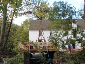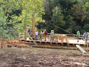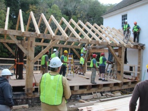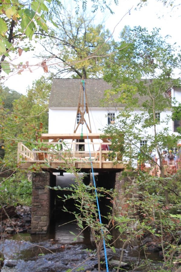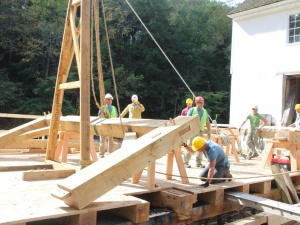 The Guild workshop fabricated and raised roughly 7,500 board feet of green oak timber. Square rule layout was used on rough sawn timber, and the frame was fabricated using hand tools and traditional timber framing methods. The oak flooring, white pine siding, standard lumber skip sheathing, and cedar shingles were also installed as part of the workshop. The stone-clad concrete raceway and sash mill foundations were already in place, so the workshop began with the fabrication and installation of timber sills and joists and the laying of the sash mill oak flooring. The flooring was laid roughly 12 feet above the water line, thereby creating a safe work platform for the frame raising. Several Montgomery County maintenance workers also assisted us during the workshop and were eager to learn timber framing skills which they can employ in the future on the County’s many historic structures. Because there were no reasonably-sized, level ground surface at Sunrise, we did the fabricating at Pennypacker Mills and trucked the timbers about five miles to Sunrise Mills. Pennypacker Mills, located on Perkiomen Creek, is a spacious park and historic site in its own right. It includes the historic Pennypacker Mills mansion furnished with the documented antique collection of the former Pennsylvania governor, Samuel W. Pennypacker.