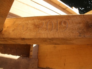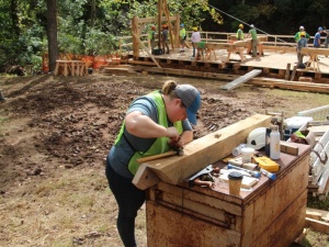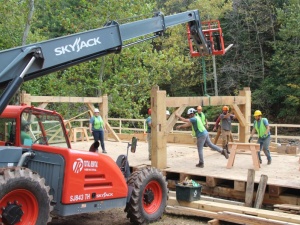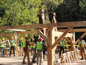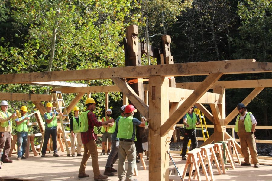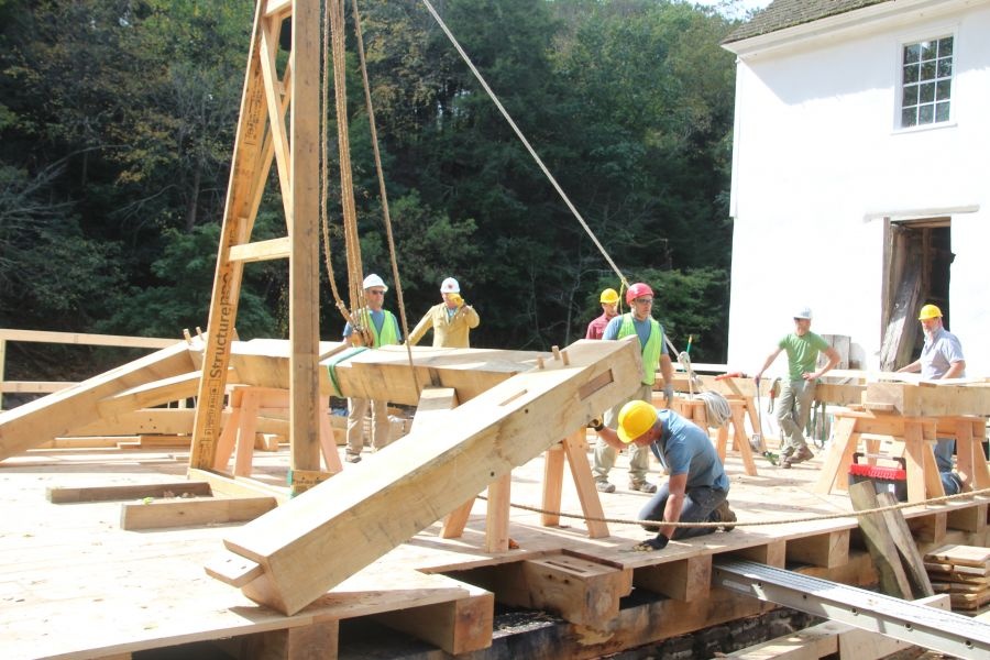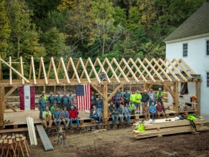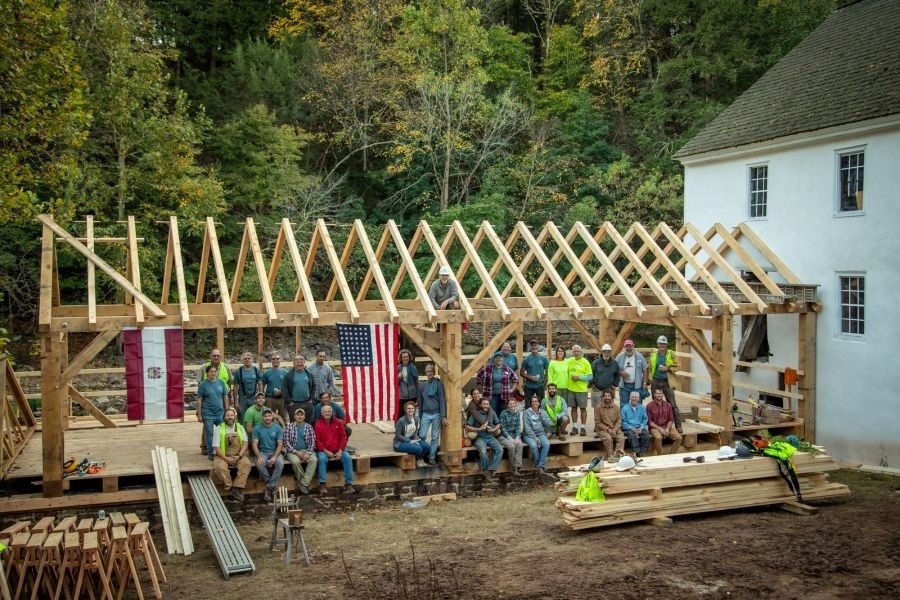 This community building project was the fabrication and raising of a replacement timber frame for the sash mill at Sunrise Mills, a historic site belonging to Montgomery County in Pennsylvania. A sash mill saws timber using a vertically reciprocating saw blade mounted in a rectangular frame which resembles a window frame or sash, hence its name.The original sash mill dates back to the early 1770s and was built a few years after completion of the 1767 grist mill, a two-story timber frame; both are listed in the National Register of Historic Places. The sash mill was built to supply timber and lumber for the surrounding buildings, including a farmhouse and Swiss bank barn, and for the local community. Both mills were powered by water diverted from the Swamp Creek, which is a tributary of Perkiomen Creek. The historic documentation of the sash mill depicts a stout, three bent frame of timbers of various sizes (and presumably species) without the consistency we expect in building today. The limited documentation is not specific enough to allow a strict piece-for-piece replacement, so we will be following the original design as well as we can while creating a structure which is conducive to training volunteers in timber framing.